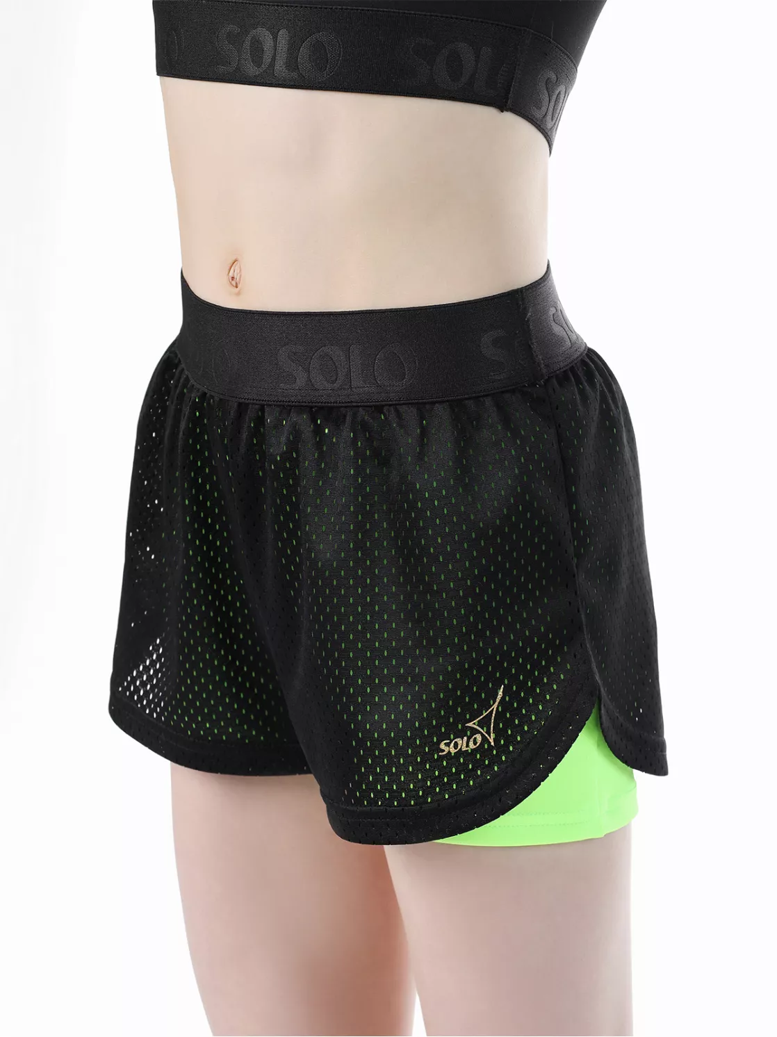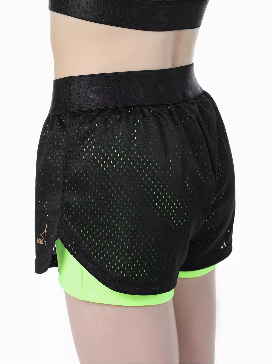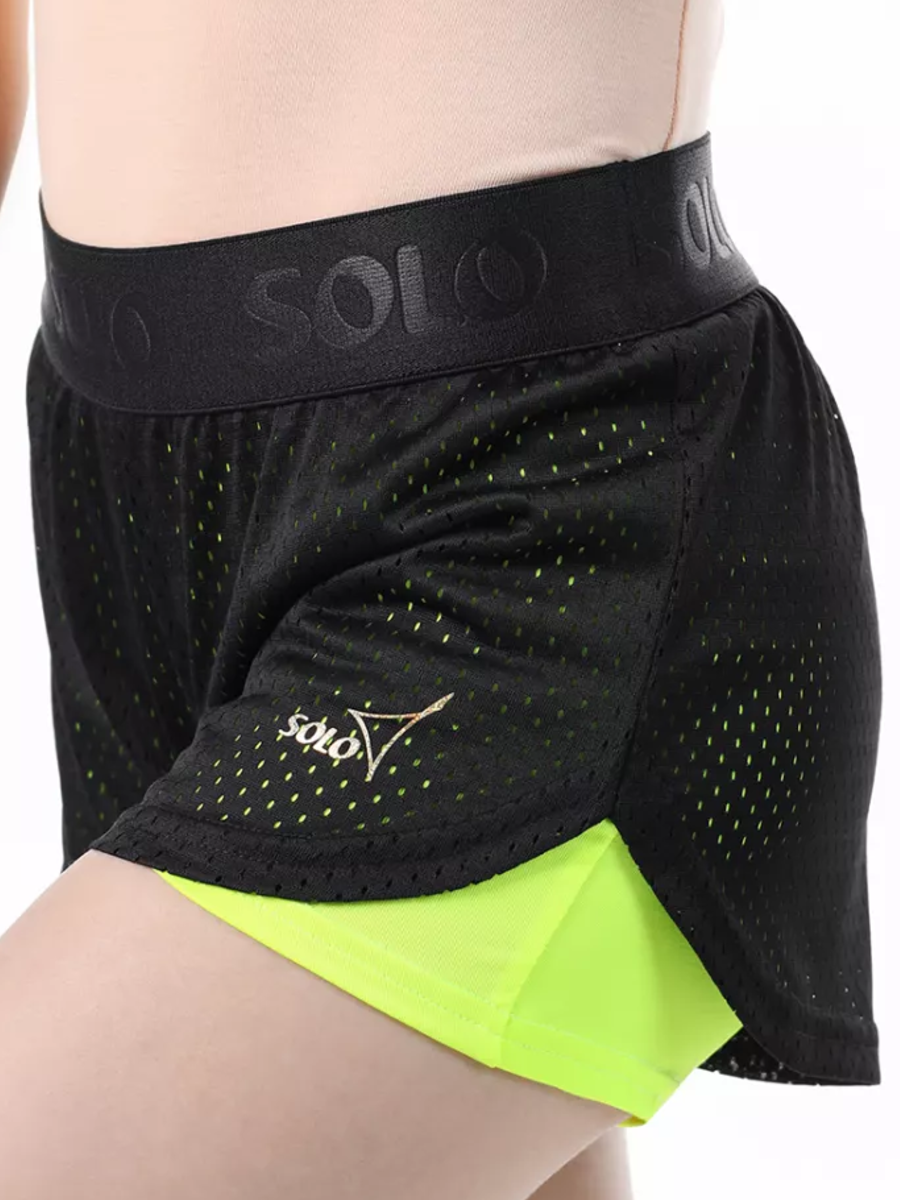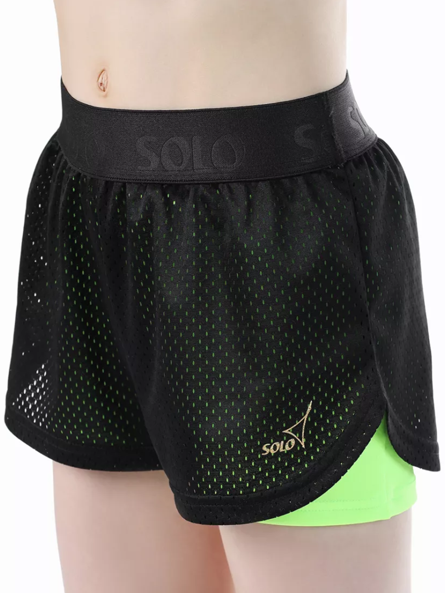 Шорты двойные: нижние- облегающие из яркого полиамида, верхние- свободные из трикотажной сетки. Гладкий плотный пояс из эластичной ленты с атласным тиснением лого Solo. Особый крой для свободы и эстетики движений. Золотистый логотип Solo.