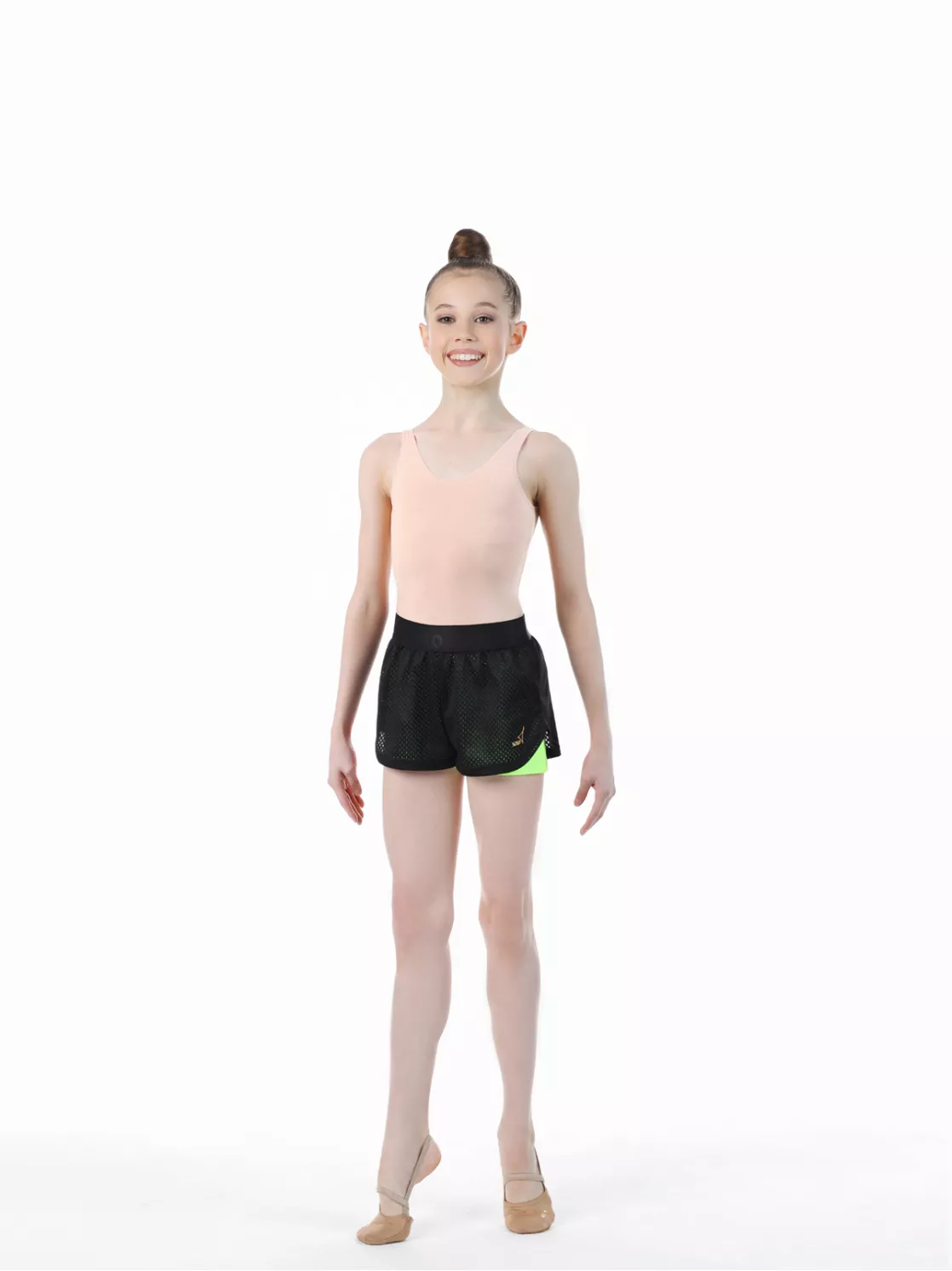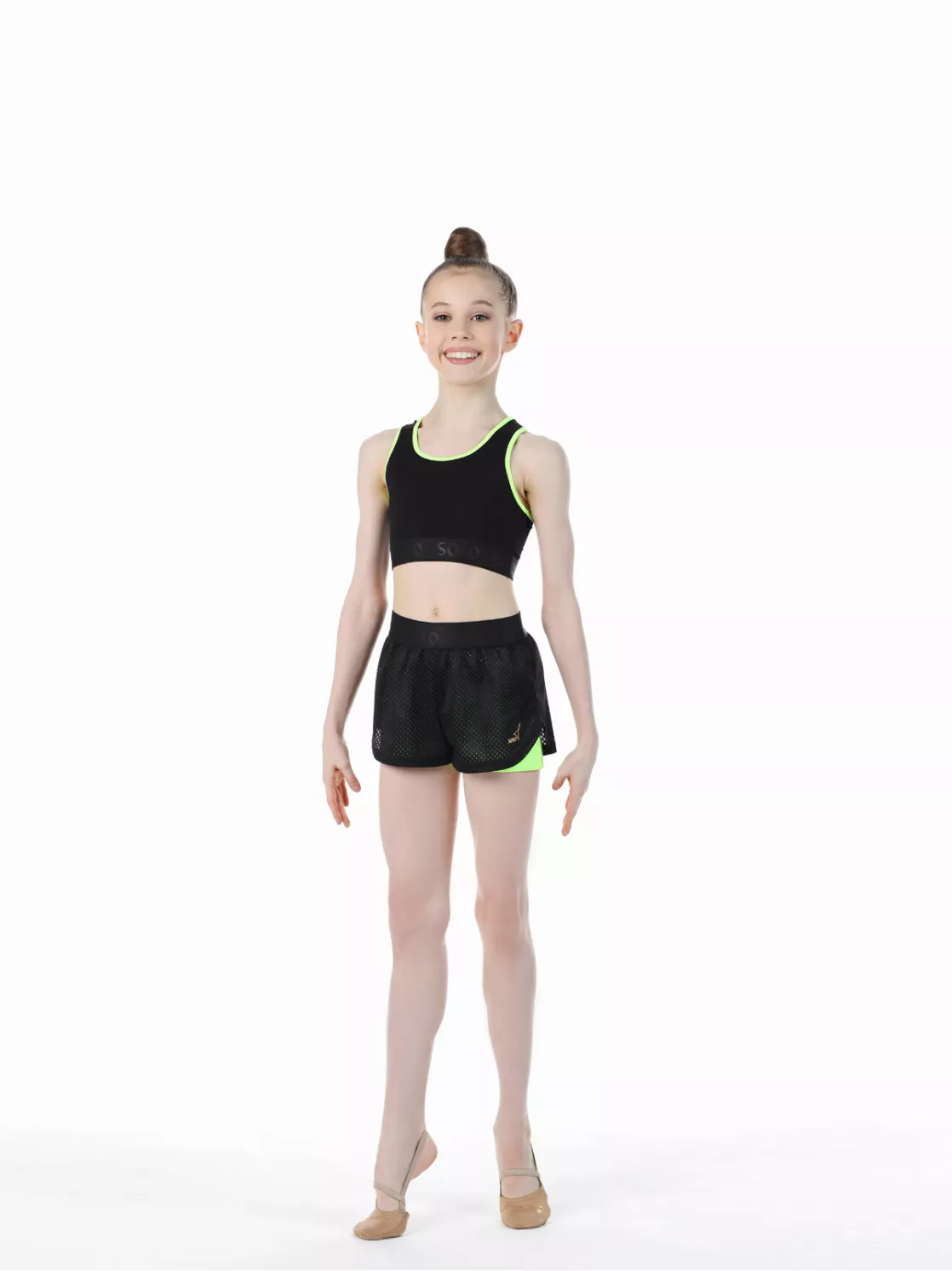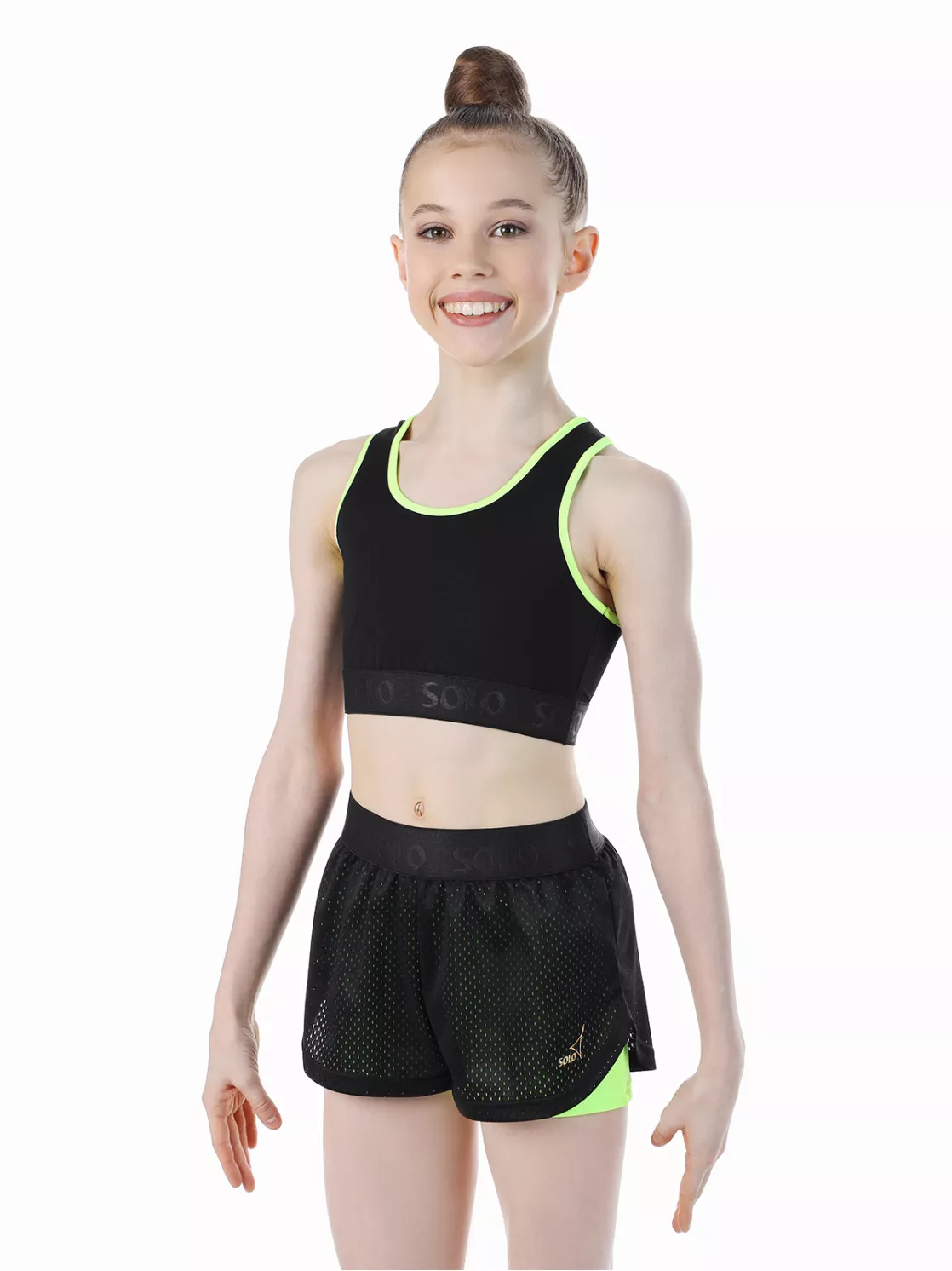 Шорты двойные: нижние- облегающие из яркого полиамида, верхние- свободные из трикотажной сетки. Гладкий плотный пояс из эластичной ленты с атласным тиснением лого Solo. Особый крой для свободы и эстетики движений. Золотистый логотип Solo.